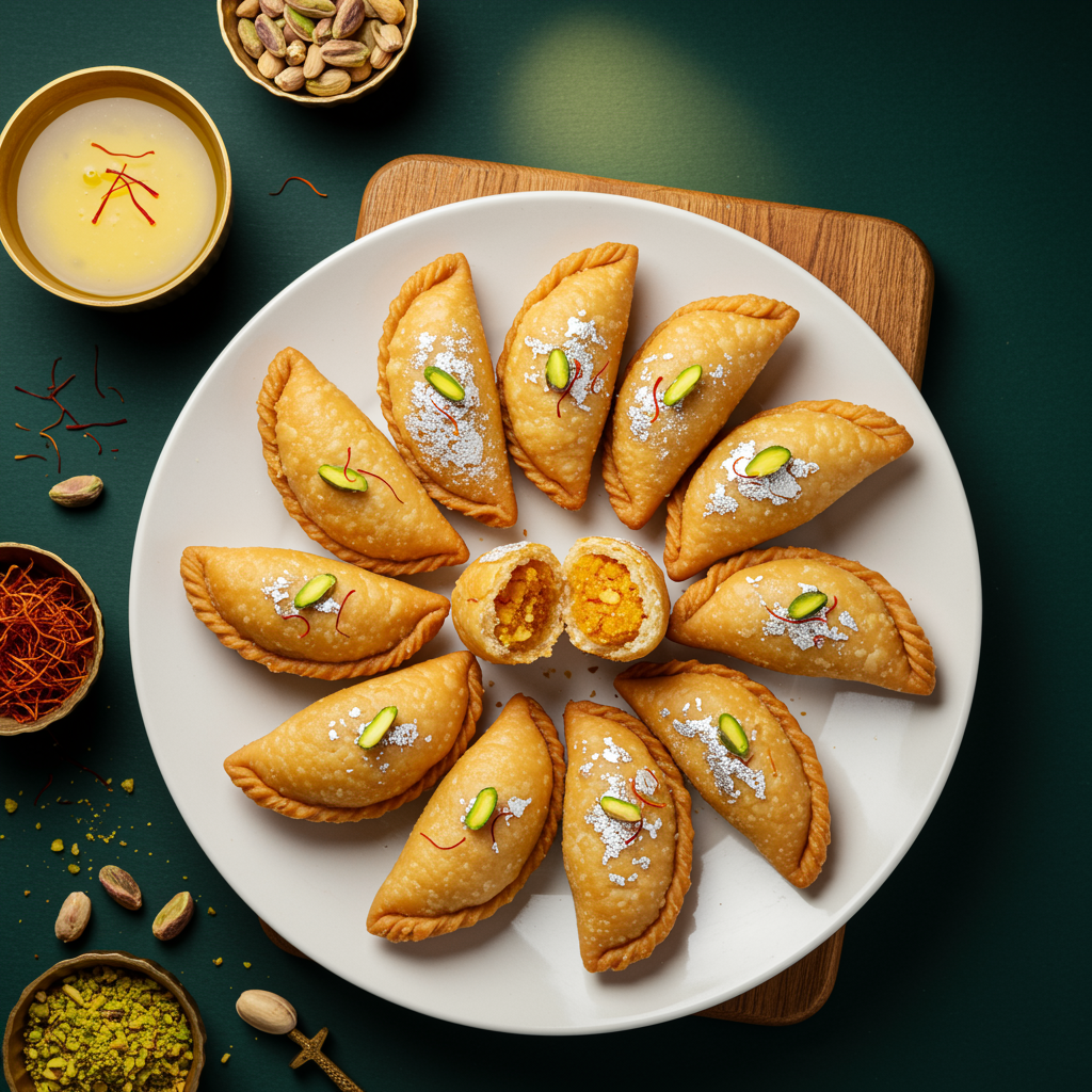 A crescent-shaped pastry filled with sweet khoya, dry fruits, and coconut, fried golden.