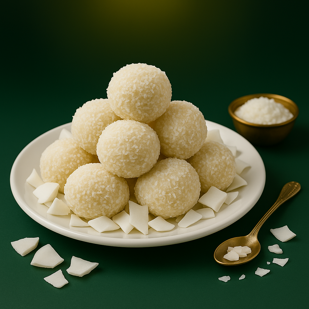A soft, chewy laddu made with fresh coconut, sugar, and ghee.