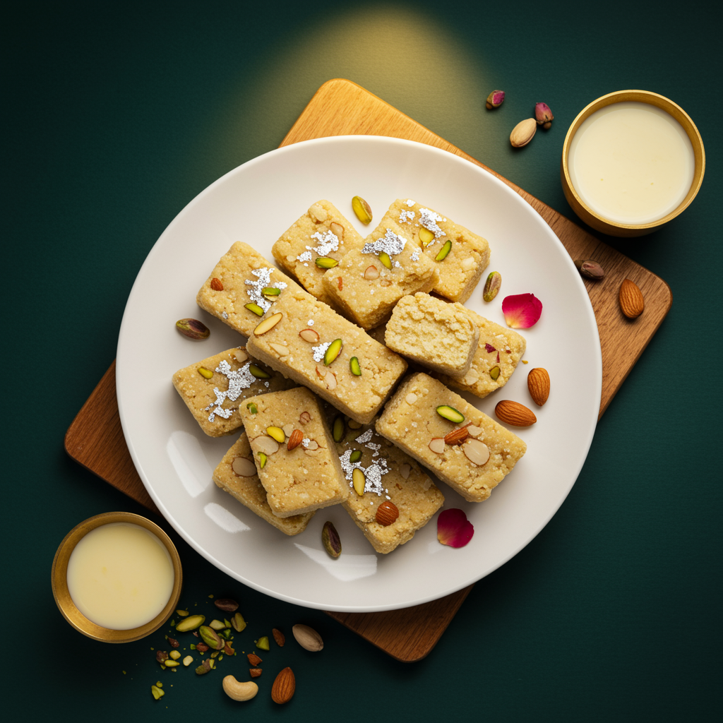 A traditional milk-based sweet with a moist, grainy texture and rich taste.